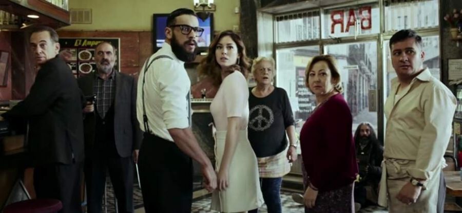 Nacho (un Mario Casas estupendo), hípster, joven y apuesto barbudo, toma Coca-Cola. Entra luego un hombre voluminoso tosiendo y va directo al baño. La chica pide un cargador de móvil a la señora Amparo, la dueña (siniestra Terele Pávez, genial); pero entra en escena Secun de la Rosa con un manojo de cables; ahora llega un barrendero que habíamos visto antes fuera; luego aterriza el indigente alterado y la dueña lo calma.