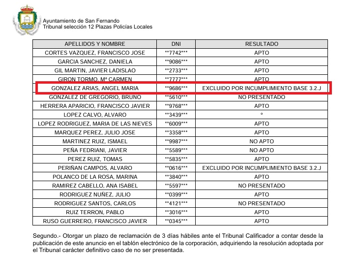 El Tribunal Calificador del Ayuntamiento de San Fernando ha acordado excluir del proceso selectivo para 12 plazas de Policía Local a Ángel María González Arias, actual concejal y secretario general del PSOE en El Puerto de Santa María, además de diputado provincial.