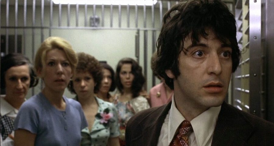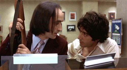 TARDE DE PERROS (1975). Un par de delincuentes de tercera, Sonny (Pacino) y Sal (Cazale) deciden atracar un banco en Brooklyn, Sonny para financiar el cambio de sexo de su amante. Debido a su falta de experiencia el robo se complica, convirtiéndose en una trampa para los atracadores, a la par que el atraco se convierte en un espectáculo para el público circundante y para la televisión en directo.
