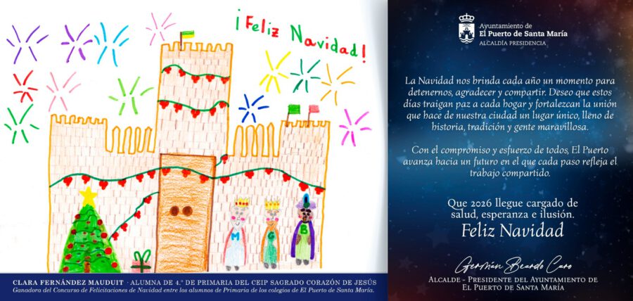 La alumna Clara Fernández Mauduit, de 4º de Primaria del CEIP Sagrado Corazón de Jesús, se ha alzado con el primer premio en la I Edición del Concurso de Dibujo destinado a ilustrar la Felicitación Oficial de Navidad del Ayuntamiento, en un certamen que ha reunido más de 300 trabajos enviados por escolares de distintos centros de El Puerto. Su dibujo será la imagen principal del Christmas institucional de este año.