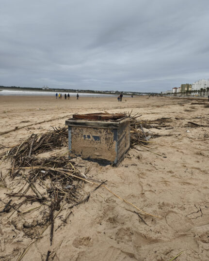 La mañana ha amanecido en la playa de Valdelagrana con una de esas imágenes que obligan a detener el paseo. Entre cañas, ramas y barro acumulados en la orilla tras la crecida del río han aparecido varias cajas de madera con panales en su interior, localizadas por paseantes a lo largo de la arena.