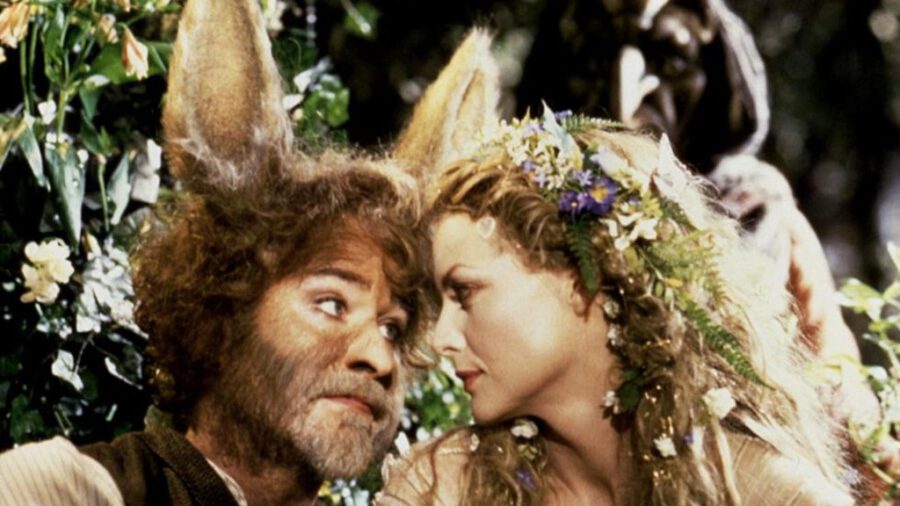 Kevin Kline tímidamente esquiva los apasionados avances de Titania (una Michelle Pfeiffer bellísima). Sus ojos han sido ungidos con ungüento mágico a instancias de su esposo Oberon (Rupert Everett), que espera robarle a la joven que ambos adoran.