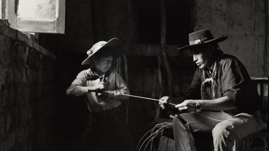 Comienza el filme con una toma monocromática de algo que no podemos reconocer. En una extensión plana de pradera bajo un cielo en pantalla ancha, la cámara enfoca un grupo oscuro que puede ser roca, tierra o animal. Finalmente, esa cosa se agita, revelando un hombre que se levanta de su sueño, botas altas, sombrero de ala ancha y capa rústica. La cabeza de un caballo emerge temblando y resoplando y vuelve torpemente a sus pies. Una sensacional representación visual del estrecho vínculo entre la vida humana, la vida animal y el paisaje.