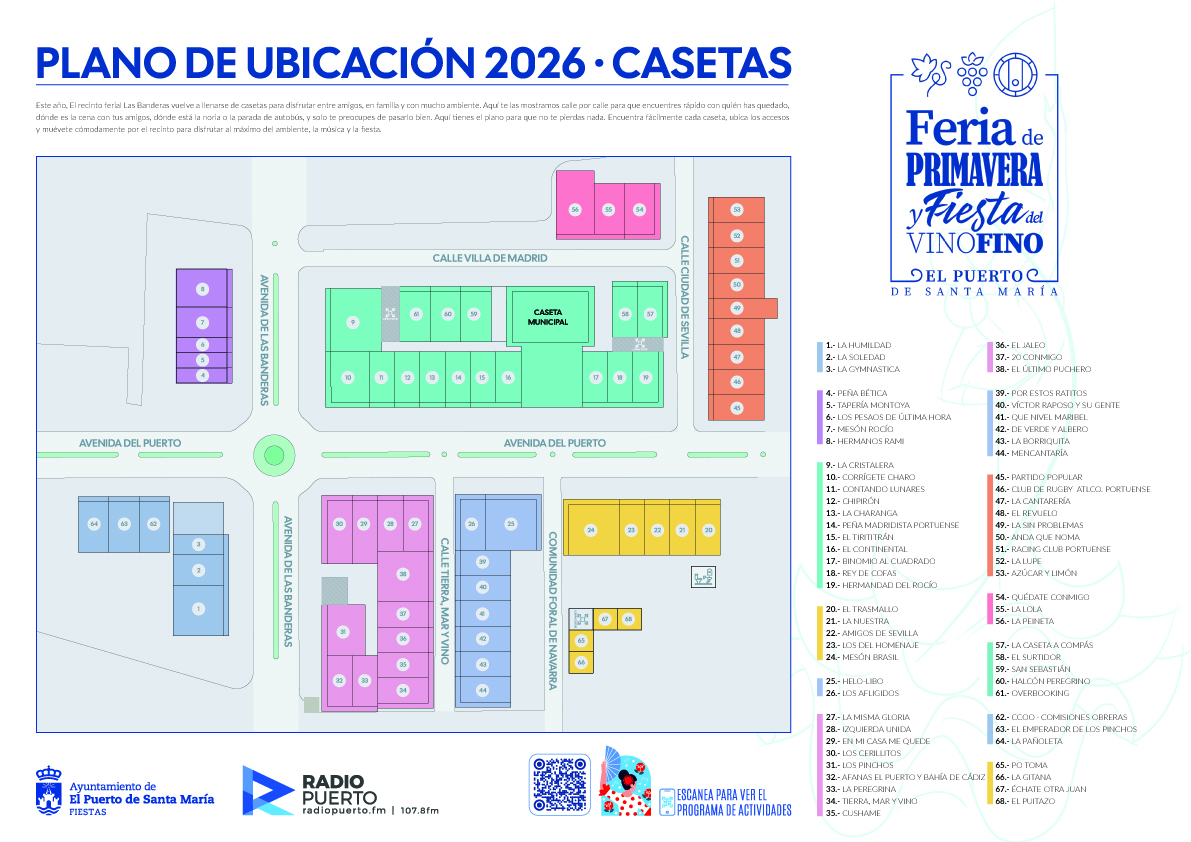 El plano de la Feria de Primavera y Fiesta del Vino Fino 2026 ya está disponible y se convierte en la base para organizar la visita al Real de Las Banderas, donde la celebración arranca el próximo 29 de abril. El documento, en formato digital, permite consultar de forma clara la ubicación de casetas, accesos y los distintos servicios repartidos por el recinto.